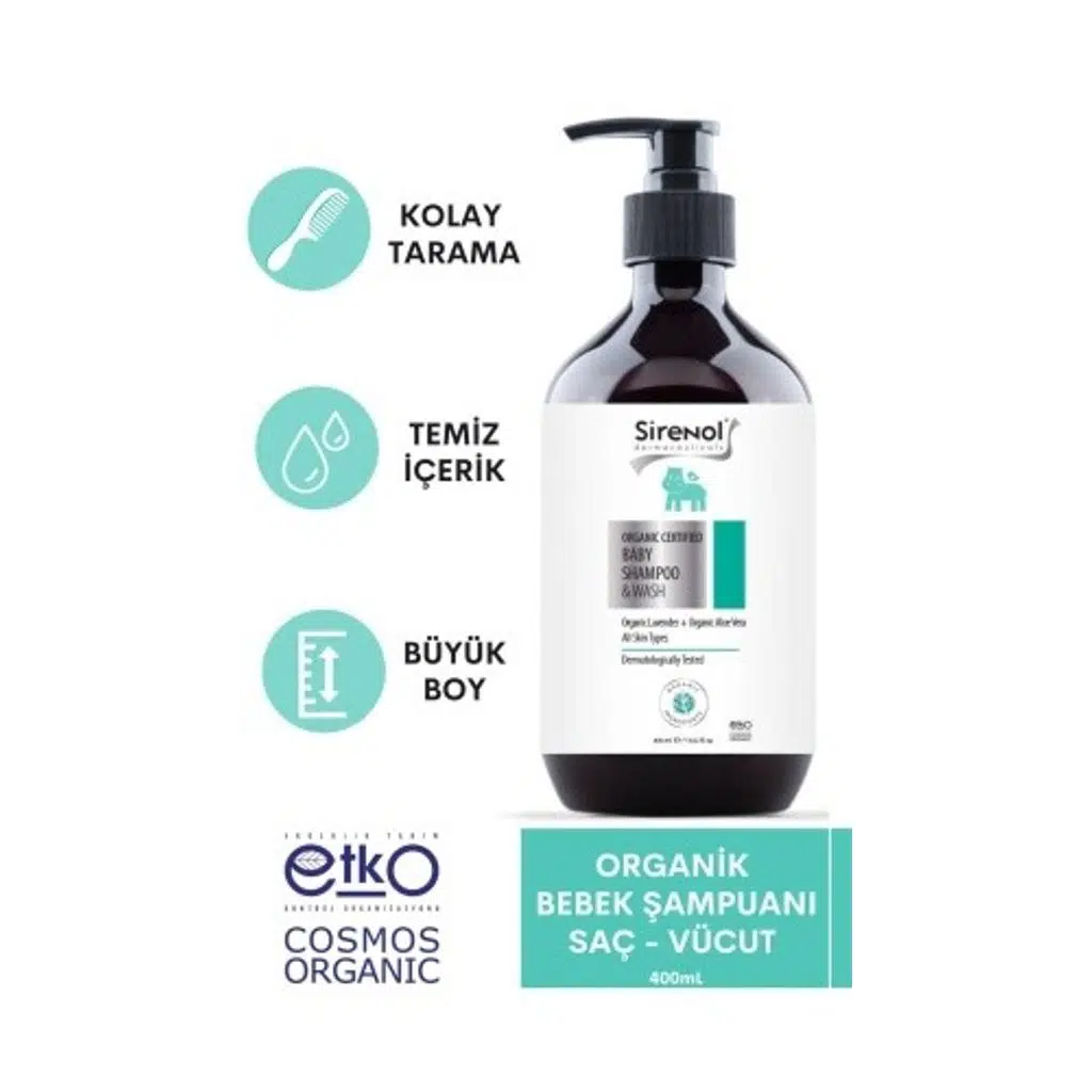 Nazik Temizlik ve Koruma: Sirenol Organik Bebek Saç Vücut Şampuanı, bebeğinizin saçını ve cildini kurutmadan nazikçe temizler. Sirenol Organik Sertifikalı Bebek Pişik Kremi ise nano olmayan çinko oksit, aynısefa, balmumu ve ayçiçeği ile pişik oluşumunu önlemeye ve hassas ciltleri yatıştırmaya yardımcı olur.